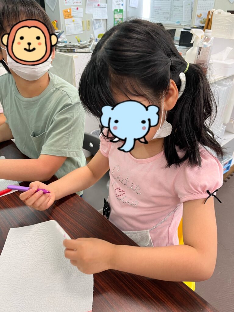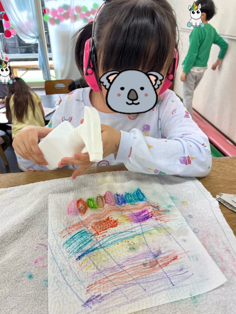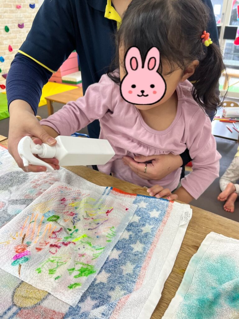 紙に水をかけたら滲むことを知り、「すごい!」と驚いていました☺